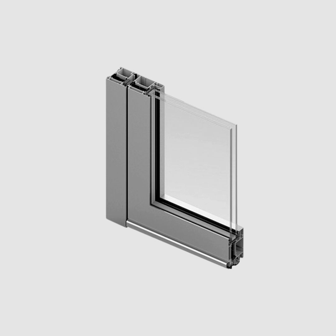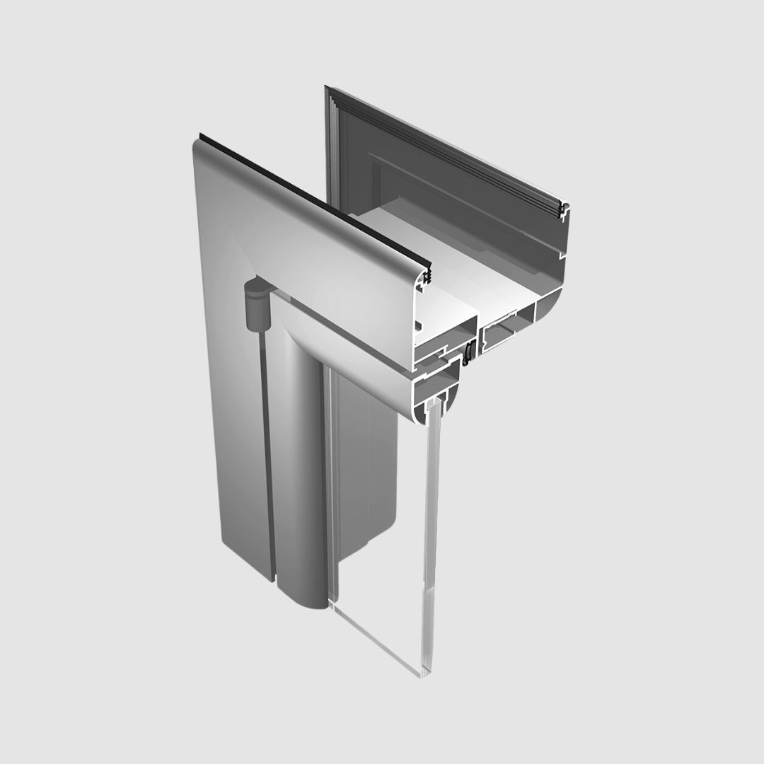 A system of aluminum profiles with an interrupted thermal bridge for the production of single-wing and double-wing revolving, transiting and evacuation doors. In addition to security and anti-burglary, this series is characterized by excellent performance, high thermal insulation properties, stability, resistance to external influences, i.e. long service life and almost unlimited design possibilities. When designing, special attention was paid to achieving aesthetic minimalism, i.e. modern, straight and clean lines, so this series has the frame and wings in the same plane both inside and outside.